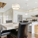 The main floor showcases rich dark oak hardwood flooring throughout the living areas, complemented by newer tile in the foyer and kitchen for durability and easy maintenance. The bright white kitchen features stone countertops, a large central island, and generous cabinetry, creating a practical and inviting space ideal for cooking, entertaining, and everyday living. Open to the living room, soaring cathedral ceilings and a feature gas fireplace wall add warmth, architectural interest, and a calm, welcoming atmosphere.