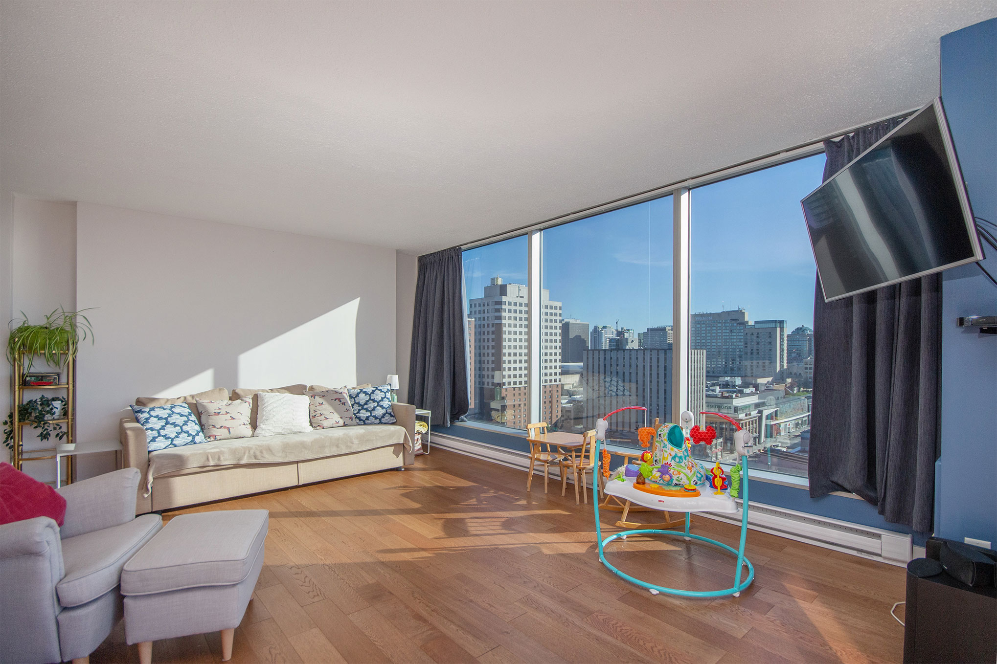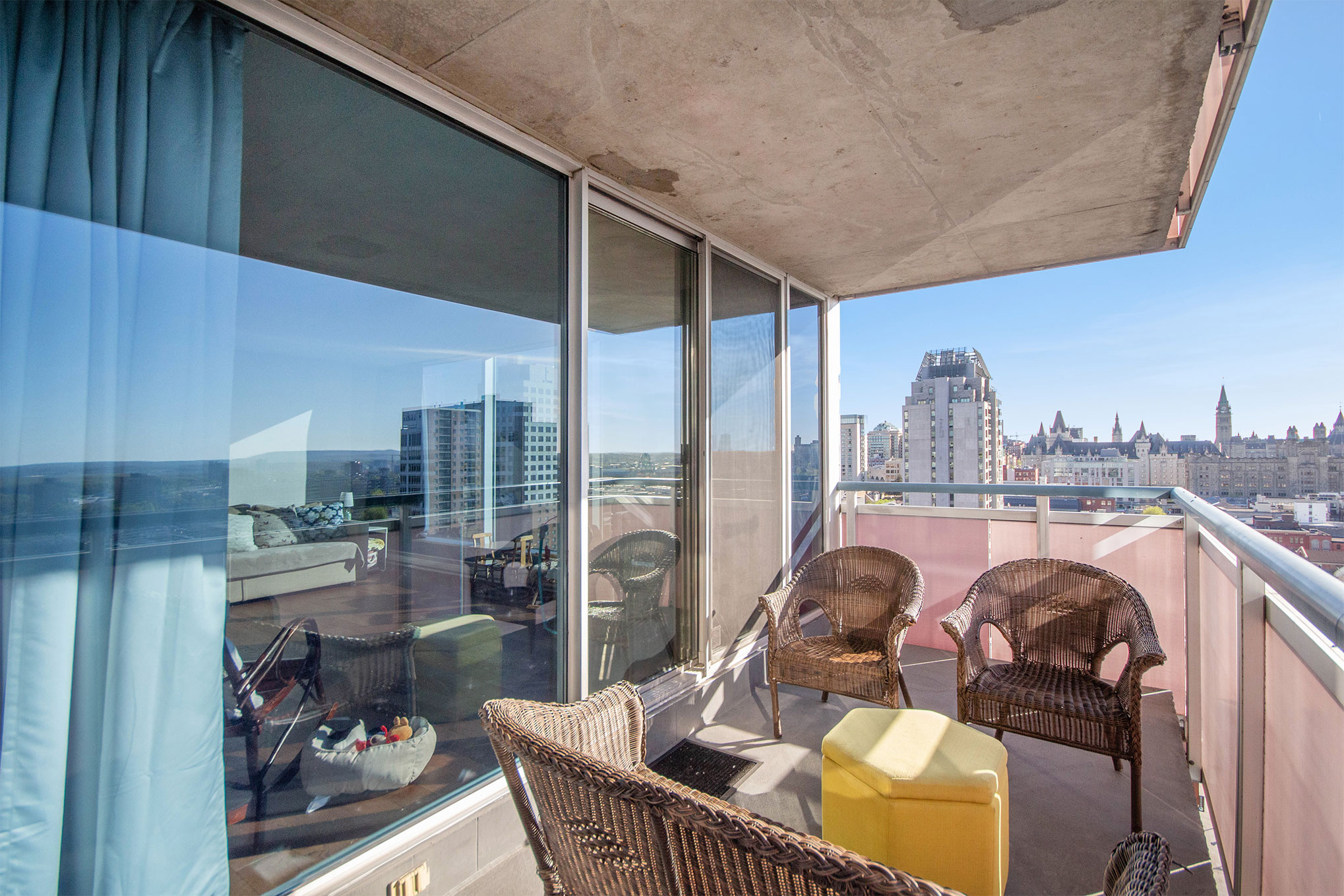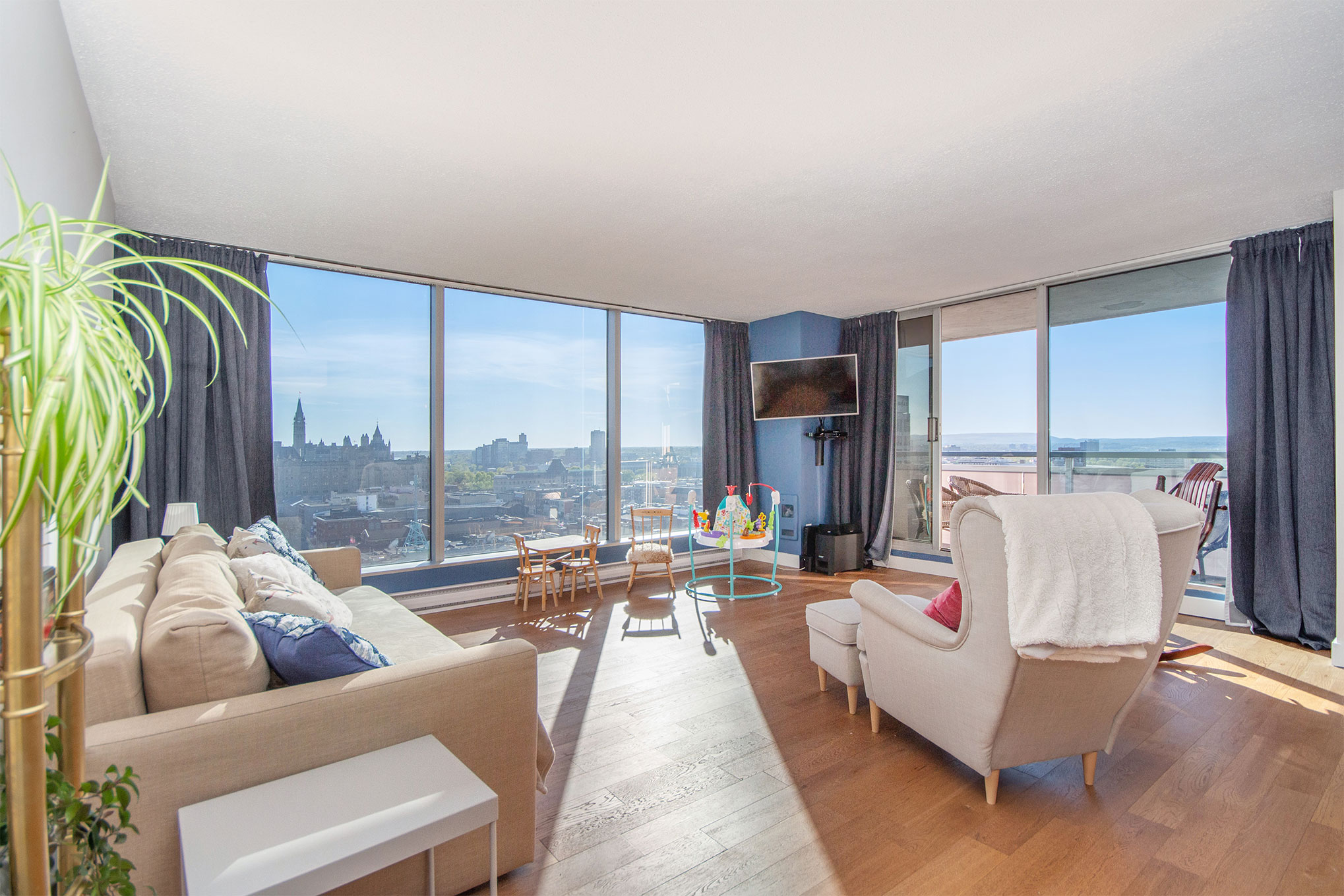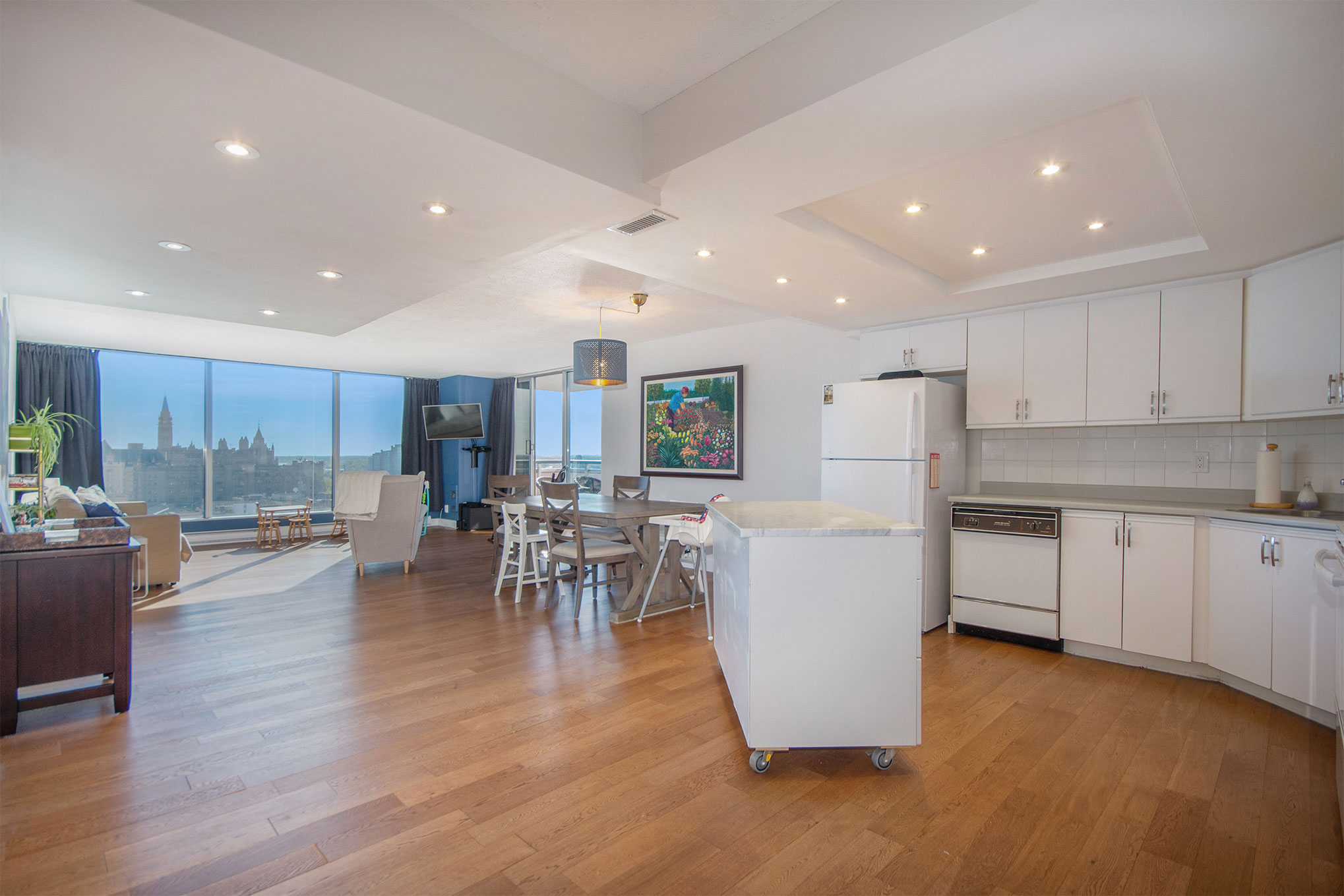 Are you looking for that absolutely incredible sunset view over Parliament Hill or a view of the Gatineau Hills? Look no further than this RARELY offered 02 model at 160 George St. 2 bedrooms, 2 full bathrooms AND 2 Balconies! Your bungalow in the sky comes in at approx. 1340 square feet! Room for a full sized living and dining room and a king sized bed in the master. Current owner has taken out the walls between the foyer, kitchen and dining room to reveal a stunning open concept layout with a view from everywhere! 2nd bedroom off the living room has access to the main bath and covered balcony. Master bdrm has a wall of closets and a full ensuite as well as access to the covered and heated balcony. In unit laundry has decent storage. One underground parking, two lockers. From your balcony you can watch the hustle and bustle of the Byward Market, sunsets and fireworks over Parliament, or turn your head to the right and enjoy the view of the Gatineau Hills. Do not miss this opportunity!