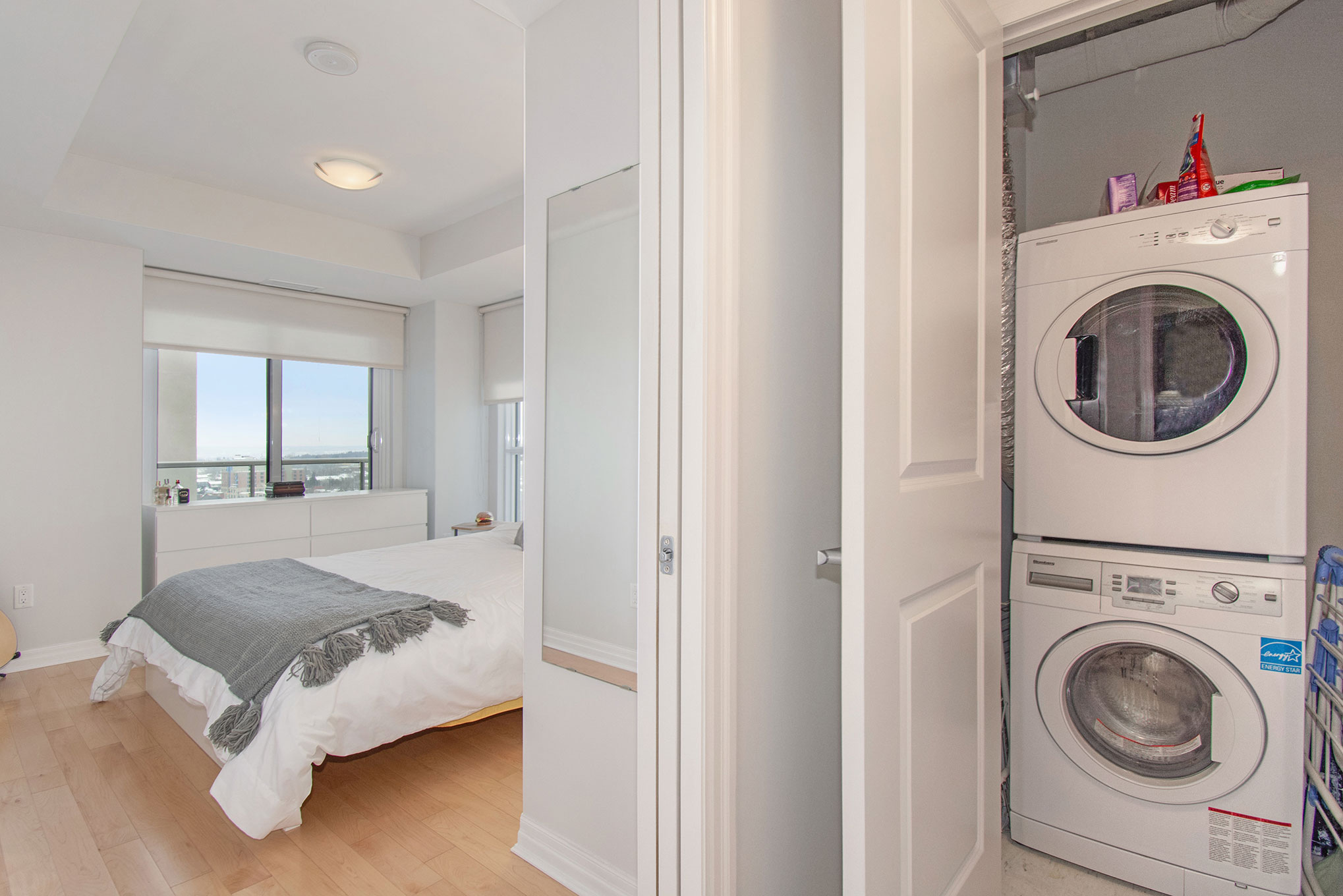 Incredibly clean, modern and bright corner unit. 1 bedroom, 1 bath Claridge Bowery model with in unit laundry. This unit exudes warmth from the moment you step through the door. Open concept layout is extremely functional allowing your living and dining areas to be whatever size you choose. U-Shaped kitchen has lovely warm birch tones and dark granite countertops. Lots of prep space and a pantry space just opposite means lots of storage. Hardwood floors throughout the living areas and modern tile choices for kitchen and baths. Access to the balcony from both the living area and bedroom. Large bedroom with double closet and acces to the roomy bathroom that has soaker tub, shower and laundry area. Unit comes with one storage locker. Currently has amazing and super clean tenants who are happy to stay should you wish to invest. Steps to anything and everything..transit, Ottawa U, the Rideau centre, NDHQ, Metro and Loblaws.
