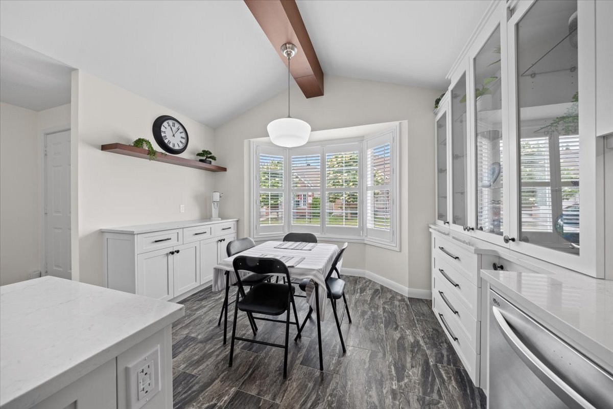 Enter through the welcoming foyer with room for a bench and a double closet. Turn into the custom kitchen with bay window. With extra cabinetry, the eating area is a lovely space for morning coffee. Catch a glimpse of the decorative beams as you move to the island and appreciate the care taken for every cooking requirement, including the paper towel roller and pull out shelving.