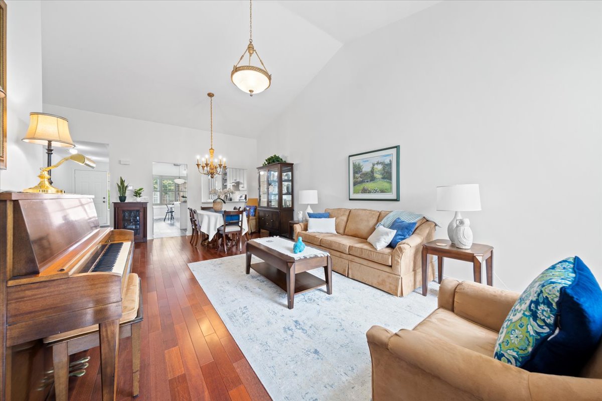 Move past the main floor laundry and a garage entry to the formal dining room area, which is also open to the main floor living space with lots of room for furniture. This great room living space is so flexible. The upgraded maple hardwood give the space a warm feel.