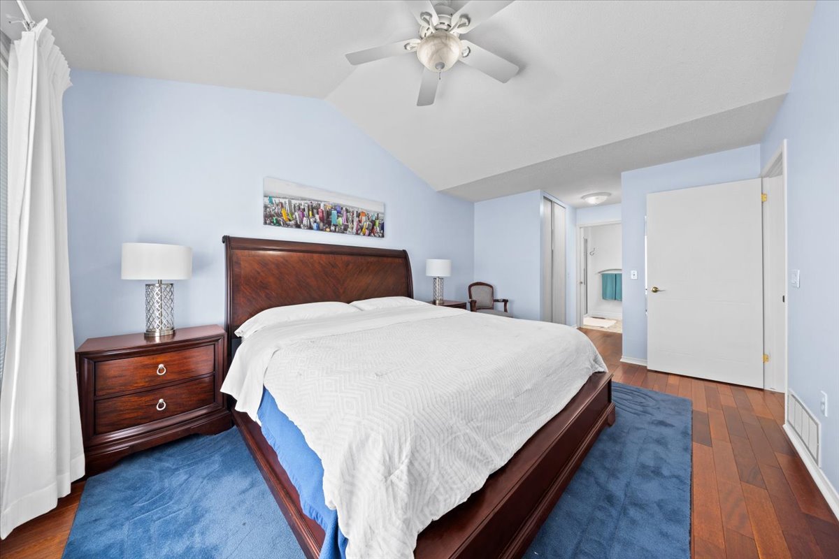 Pass the two piece powder room to the Primary suite. The suite can easily handle a king sized bedroom set and has access to a walk-in closet, a double closet and a beautifully upgraded 3 piece bathroom.